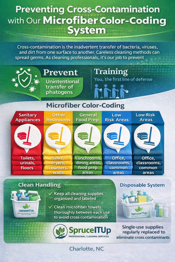 We use a color-coded microfiber system to prevent cross-contamination.